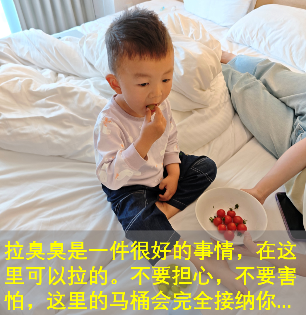 娃醒來後我們一邊催他吃水果,一邊給他洗腦,讓他放下戒備安心去拉。
