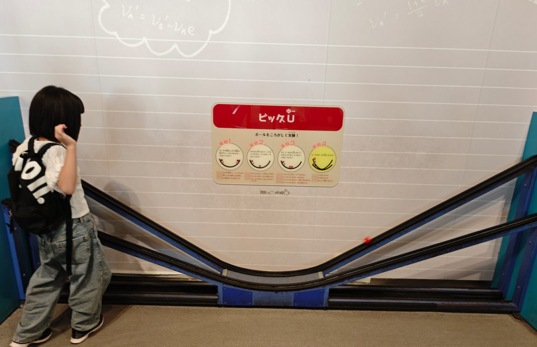 下圖裝置,小朋友可以把球放到一陡一緩兩個軌道上,看哪條軌道的球滑得更遠、在最高處懸停的時間更久。但每個娃只發了一個球,想實驗至少兩個球,這教會了娃想要探究物理,就要團隊合作,沒有哪一篇paper只有一個作者!