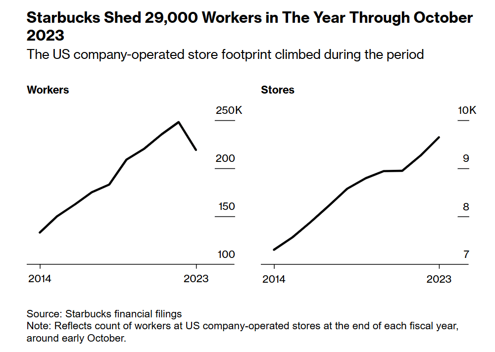彼時的文件顯示,截至2023年10月的一年裏,星巴克新增了380家門店,但是在美國自營門店裁員2.9萬人。