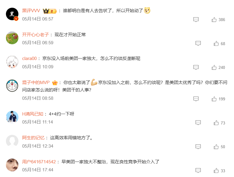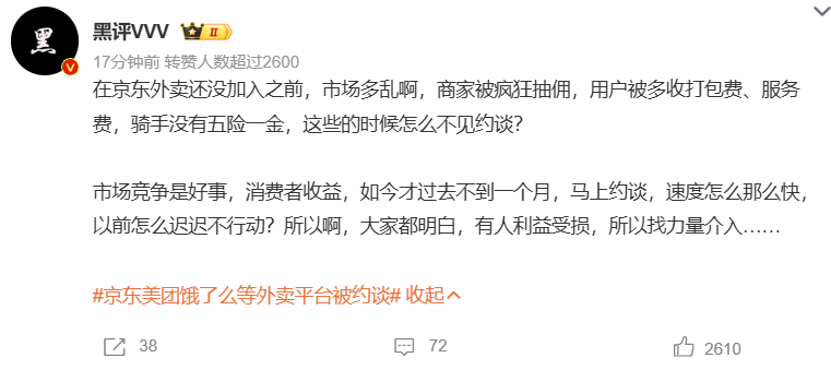 有人認為,這是因為三大外賣平台的競爭已經失態,監管部門出面協調。也有網友認為,這是京東入局以來,給整個外賣行業帶來的衝擊實在太大,作為既得利益者並且佔據行業絕對霸主地位的美團有些不堪壓力,主動向監管部門反應,要求監管部門出面,減輕自己的壓力。