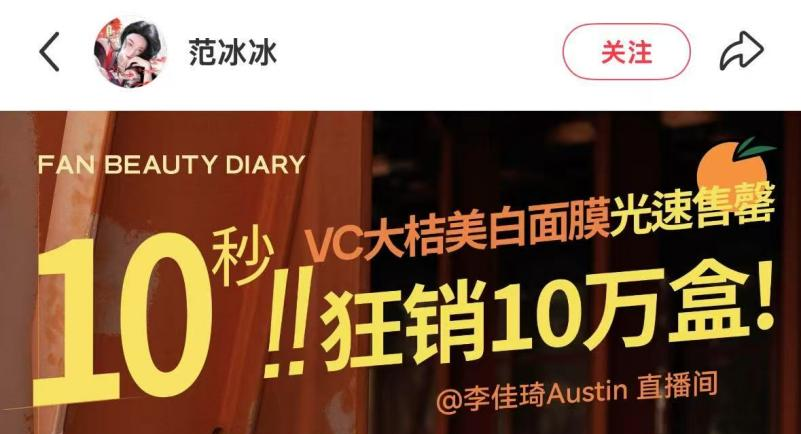 5月13日晚,在李佳琦的直播間,FAN BEAUTY旗下最新推出的面膜——“VC大桔美白麪膜”直接賣爆了,10秒買了10萬盒,光速售罄,連范冰冰自己都在小紅書上説:“有點嚇人。”目前,該產品的補貨日期已經推到了5月31日。