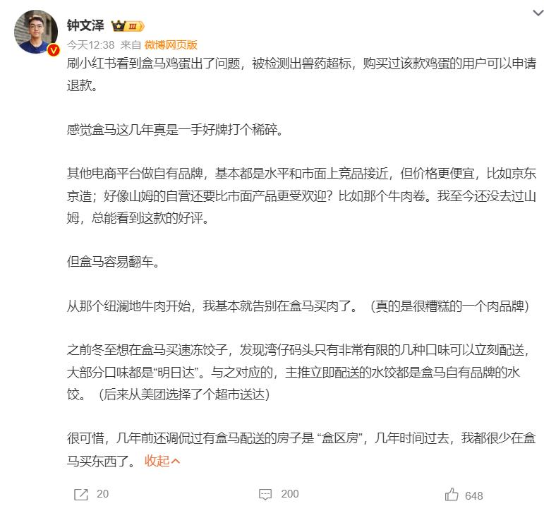 針對此事,博主鍾文澤也表達了自己的看法,他表示感覺盒馬這幾年真是一手好牌打個稀碎。其他電商平台做自有品牌,基本都是水平和市面上競品接近,但價格更便宜,比如京東京造;好像山姆的自營還要比市面產品更受歡迎?比如那個牛肉卷。我至今還沒去過山姆,總能看到這款的好評。但盒馬容易翻車。從那個紐瀾地牛肉開始,我基本就告別在盒馬買肉了。