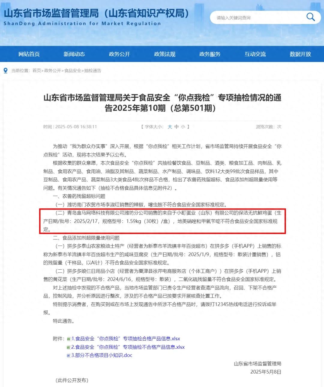 5月8日,山東省市場監督管理局發佈《關於食品安全“你點我檢”專項抽檢情況的通告2025年第10期》。其中顯示青島盒馬網絡科技有限公司濰坊分公司銷售的來自小町蛋業(山東)有限公司的保潔無抗鮮雞蛋,被檢測獸藥超標,地美硝唑和甲氧苄啶不符合食品安全國家標準規定。