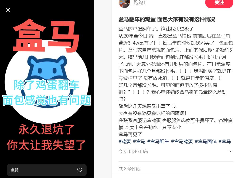 還有網友稱,從20年至今日 我一直都是盒馬鐵粉,前前後後在盒馬消費近3-4w是有了!!然後年前時候跟我媽買了一包麪包片。盒馬家自產常規的麪包片,上面的保質期寫的是15天。結果前幾日我看麪包到現在都沒長毛!
