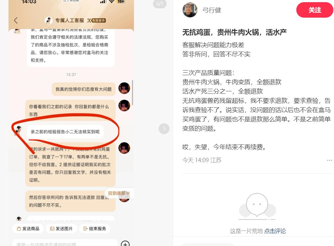 有網友表示今年結束不再續費,無抗雞蛋獸藥殘留超標,我不要求退款,要求查驗,告訴我查驗不了。説實話,沒問題的話以後也不會在盒馬買雞蛋了,有問題也不是退款那麼簡單。不是之前簡單變質的問題。