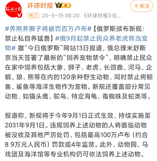 而且我們要知道,不要説是猛獸,就是體型大一點的狗也是不適合在居民區飼養的。這樣的猛獸出現在城市裏,就算是俄羅斯人也難免會遭到驚嚇。如果這些猛獸突然發狂攻擊人,後果可就更嚴重了。