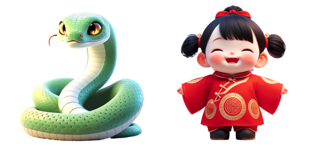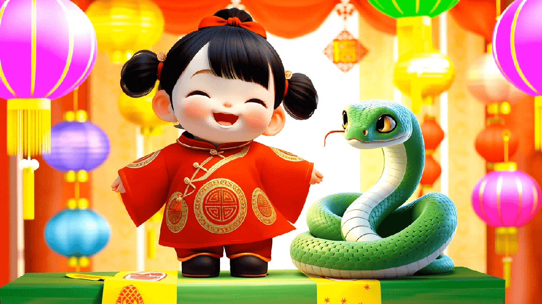 提示詞:在一個歡樂而充滿節日氣氛的場景中,穿着鮮豔紅色春服的小女孩正與她的可愛卡通蛇嬉戲。她的春服上繡着金色吉祥圖案,散發着喜慶的氣息,臉上洋溢着燦爛的笑容。蛇身呈現出亮眼的綠色,形狀圓潤,寬大的眼睛讓它顯得既友善又幽默。小女孩歡快地用手輕輕撫摸着蛇的頭部,共同享受着這温馨的時刻。周圍五彩斑斕的燈籠和綵帶裝飾着環境,陽光透過灑在她們身上,營造出一個充滿友愛與幸福的新年氛圍。