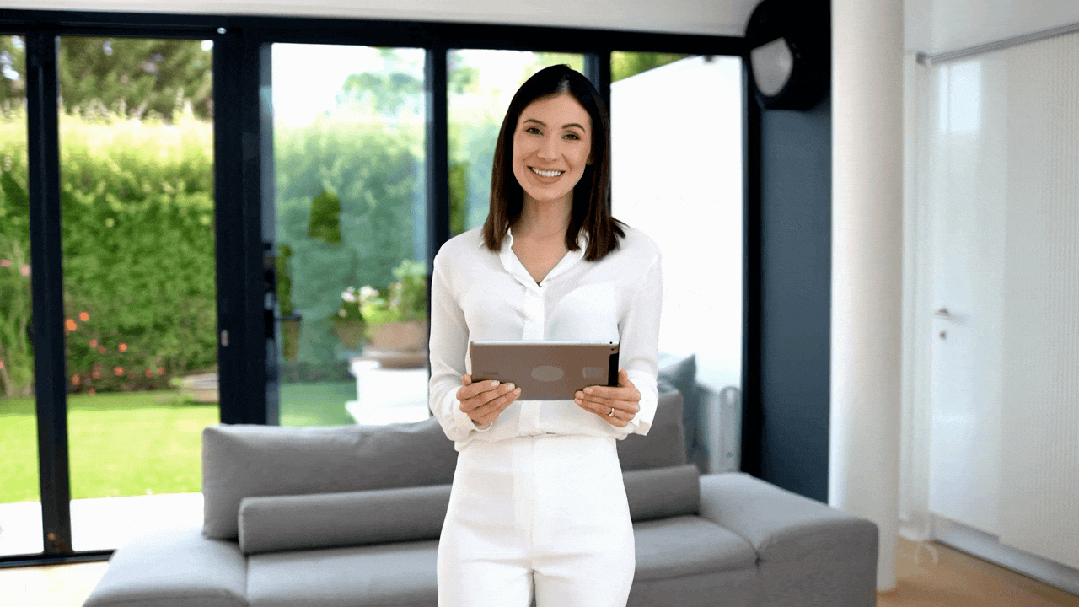 提示詞:紀實攝影風格,房產自媒體博主站在一間現代化的客廳中央。博主穿着簡潔時尚的衣物,面帶微笑,兩隻手舉在身前,手上空無一物正對着鏡頭介紹房屋情況。背景是一間寬敞明亮的客廳,傢俱簡約現代,落地窗外是綠意盎然的花園。房間內光線充足,温馨舒適。中景全身人像,平視視角,輕微的運動感,如手指輕點屏幕。