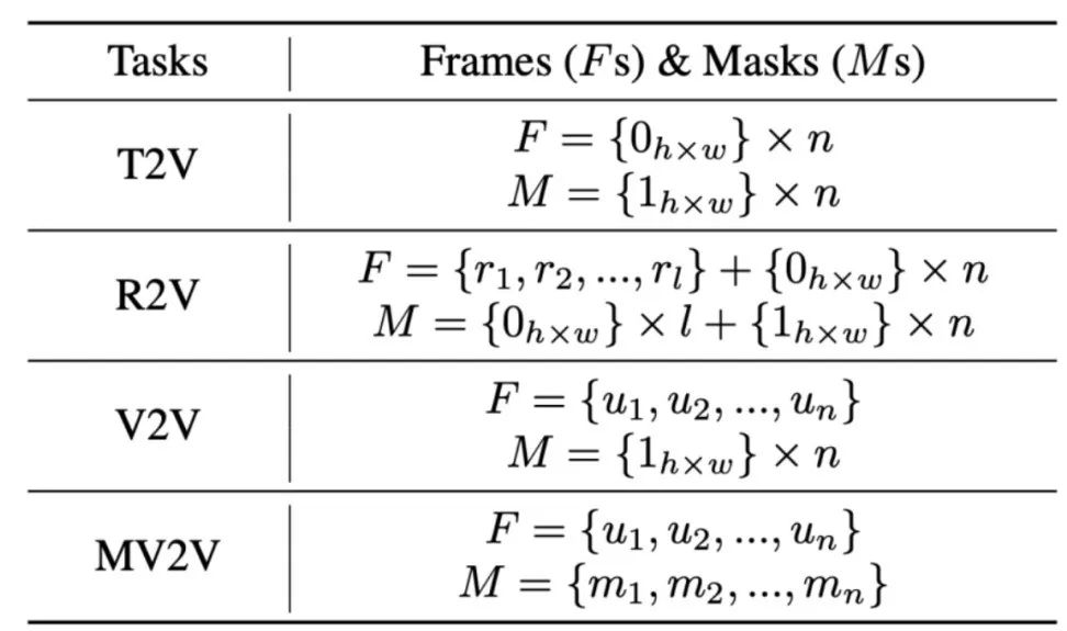 統一表徵:將視頻生成和編輯的輸入定義為輸入視頻、輸入掩碼、參考圖像等;