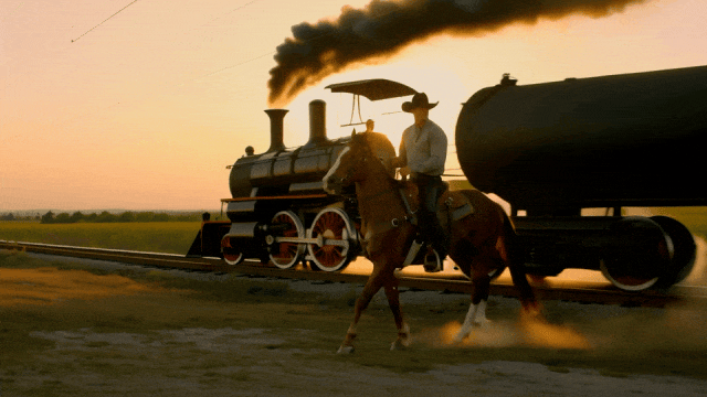 提示詞:一個外國男人騎着一匹棕色的馬在鐵軌旁奔跑。他穿着一件灰色襯衫和黑色牛仔帽,背景是一列蒸汽火車正在行駛中,它由多個車廂組成,並且冒着煙霧。天空是橙色的日落景象。