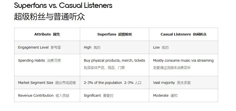 市場研究機構Luminate的一項數據顯示,近20%的美國聽眾可被歸類為超級粉絲。這部分粉絲願意支付普通人兩倍以上的音樂費用,預計將為唱片行業帶來每年42億美元的收入機會。