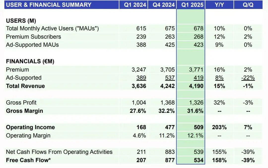 甚至,由於國內外市場環境的不同,TME有着自己的優勢。比如相比Spotify高企的內容成本,TME 超30%的經營利潤率(operating margin)是Spotify望塵莫及的,後者基本在10%左右,甚至直到2024年才首次實現全年盈利。但從付費率上看,相比Spotify接近40%(38.86%)的付費水平,TME(22.14%)顯然還有提升空間。