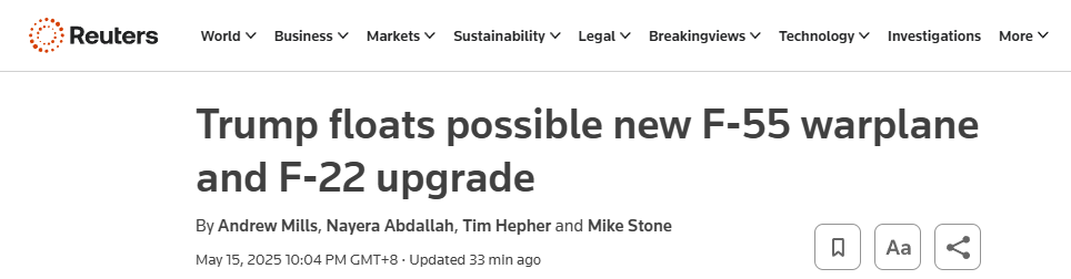 路透社15日稱,特朗普在中東訪問期間提出了這個設想。他將F-55稱為F-35的升級版,似乎與洛馬公司在下一代空中優勢(NGAD)戰鬥機項目上輸給波音後,提出的 “最有價值”替代方案的言論相呼應。特朗普説:“我們將生產F-55戰鬥機,這將是兩個發動機的F-35超級升級版本,然後我們還要生產F-22。我認為世界上最漂亮的戰鬥機是F-22,但我們將生產超級版本的F-22戰鬥機,它將是‘猛禽’戰鬥機非常現代的版本,我們將很快開始。”