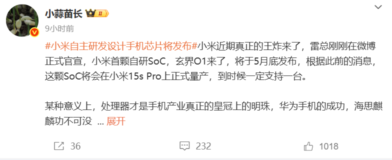 曾經與小米結過樑子、華粉大V@小蒜苗長 也發微博表示“對小米的很多事兒有看法,但在自研SoC這件事兒上,堅決支持”: