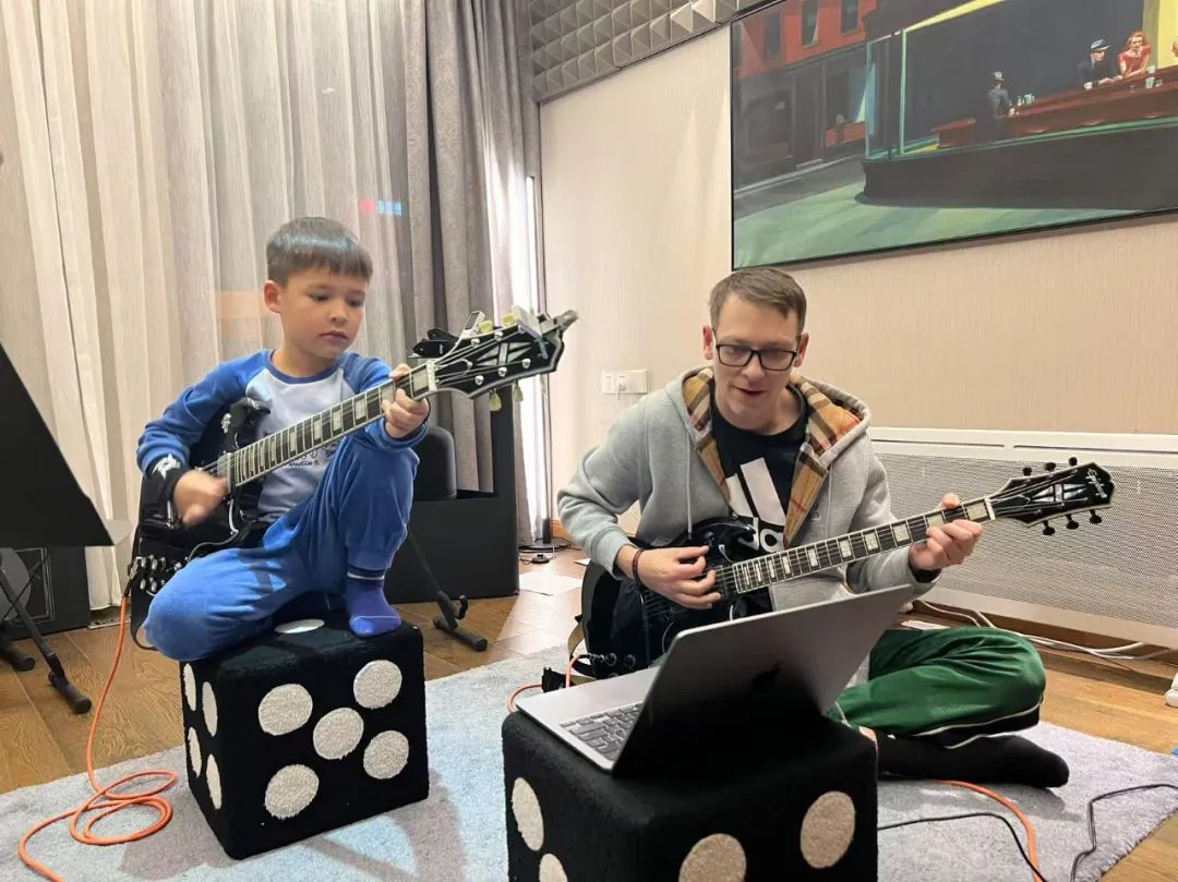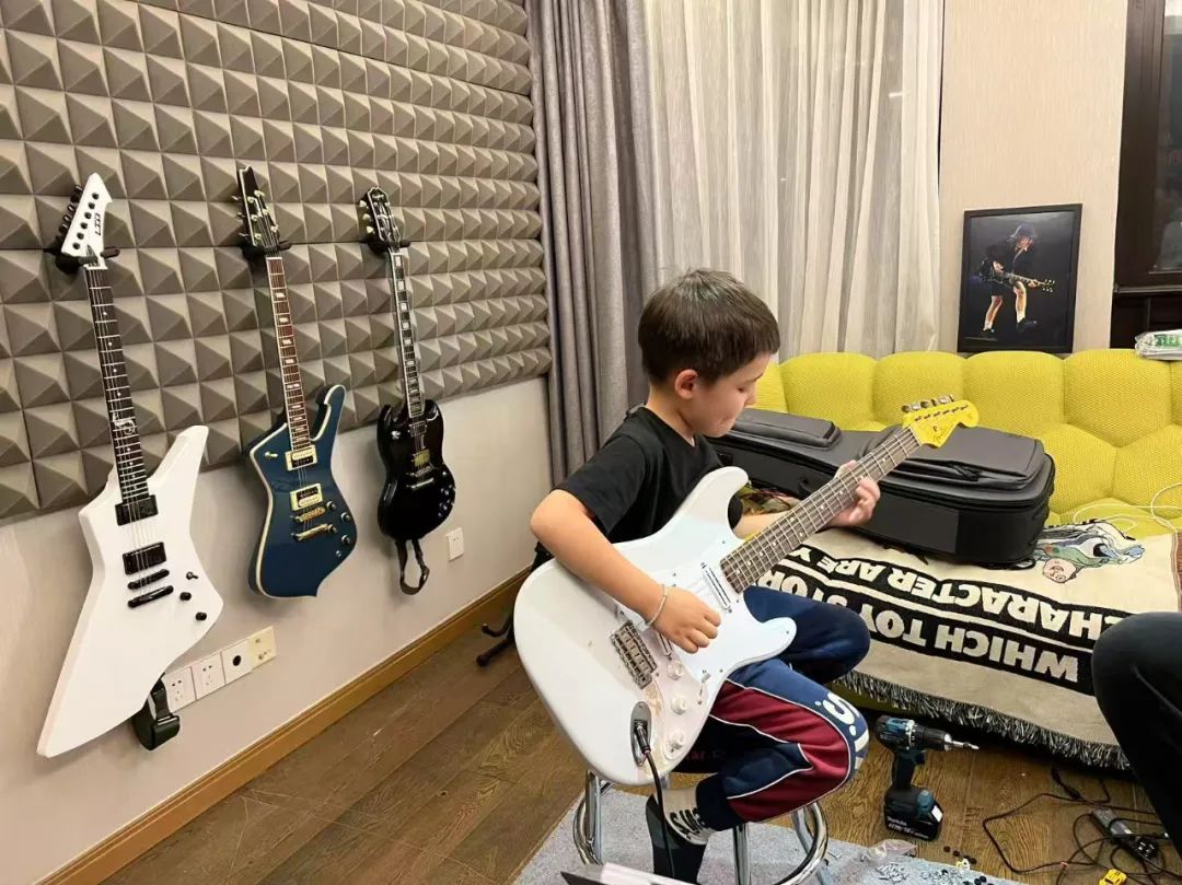 很快,家裏有了堪比專業琴房的練琴室,牆上掛着五六七八把電吉他。連吉他老師來了家裏,都忍不住流連忘返,咱就是説,拼裝備,木馬爸爸從來沒有輸過。
