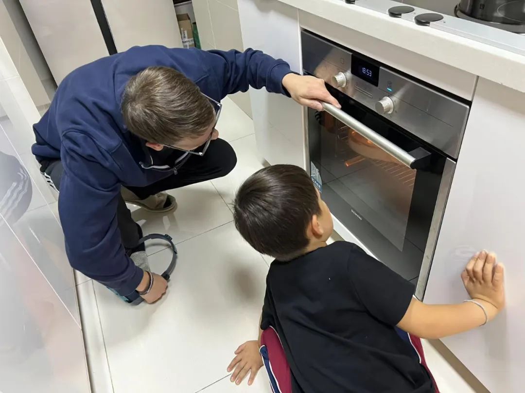 週末的晚上,他和小木馬兩個人蹲在烤箱前,一臉嚴肅地看着烤箱裏面。