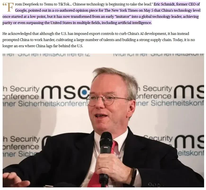 3. 在關鍵前沿技術領域,如果説八年前仍舊是在學步、模仿的狀態,至少現在中國在一些關鍵領域是站穩了,並且是可以小跑了,能夠對美國的創新有所突破了,比如AI大模型、工業機器人、新能源電池、智能家電等等。正如曾任谷歌首席執行官兼董事長Eric Schmidt,最近在《紐約時報》發表的題為《中國遠遠落後於美國的時代已經終結》文章説的那樣: