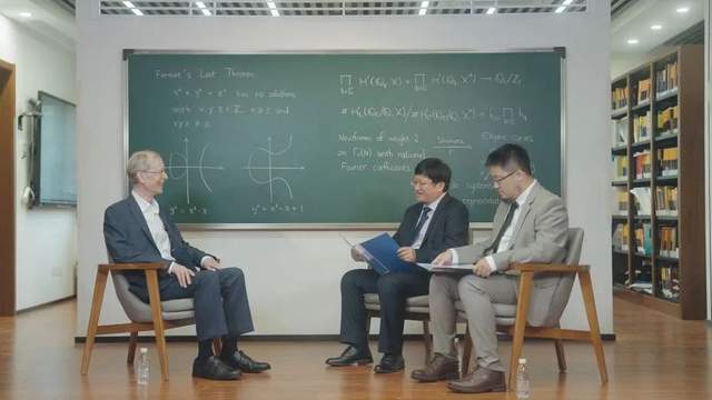 訪談現場,從左到右:懷爾斯、田野、朱藝航 | 視頻、圖片由丘成桐數學科學中心獨家授權