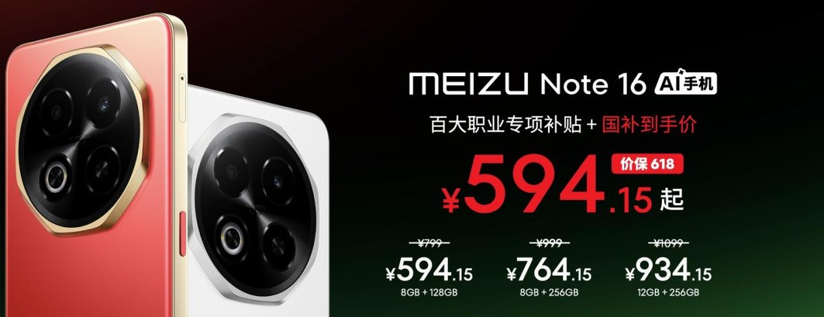 但重點在於,本次魅族把Note 16的售價壓到了百元檔。其8GB+128GB版本機型在疊加國補、百大職業專項補貼後僅需594.15元。