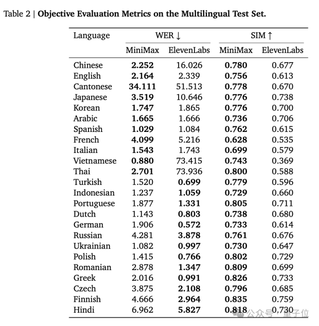 在SIM方面,MiniMax-Speech在所有測試語言中均優於ElevenLabs Multilingual v2,表明其説話者編碼器和合成流程在保留説話者身份方面更為有效。