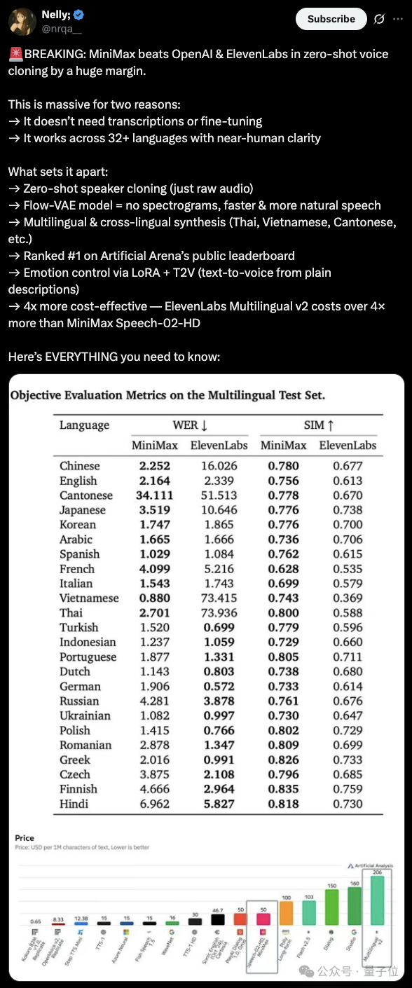 並且在提供SOTA級性能同時,定價僅為ElevenLabs的一半甚至四分之一,性價比也稱得上“全球SOTA”了。