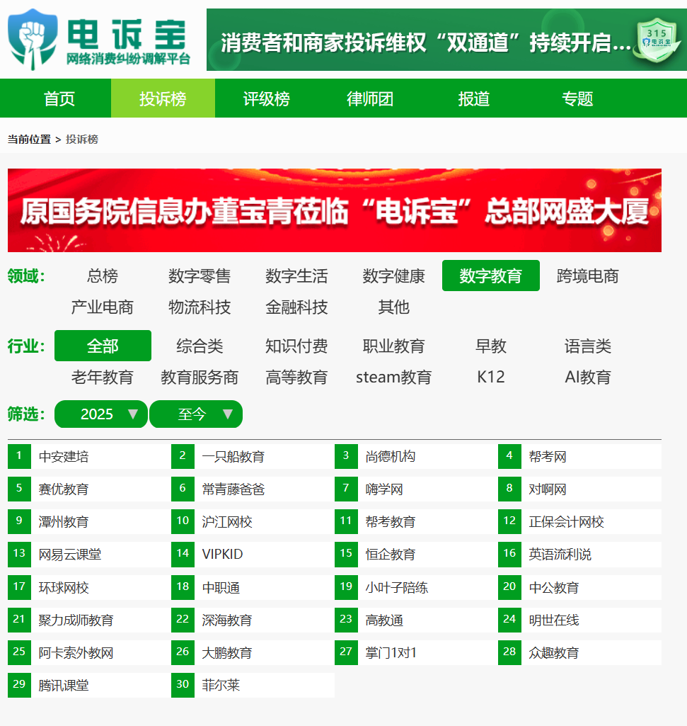 2025年至今,“電訴寶”受理投訴中涉及的數字教育領域用户有效投訴顯示(依據投訴量排行),“VIPKID”排名第14位。最新評級為**“不予評級”**。除此之外,其他被投訴的類似平台還有:**中安建培、一隻船教育、尚德機構、**幫考網、賽優教育、嗨學網、常青藤爸爸、潭州教育、幫考教育、滬江網校、正保會計網校、網易雲課堂、恆企教育、英語流利説、環球網校、小葉子陪練、深海教育、聚力成師教育、中公教育、中職通、高教通、明世在線、阿卡索外教網、掌門1對1、眾趣教育、騰訊課堂、菲爾萊。