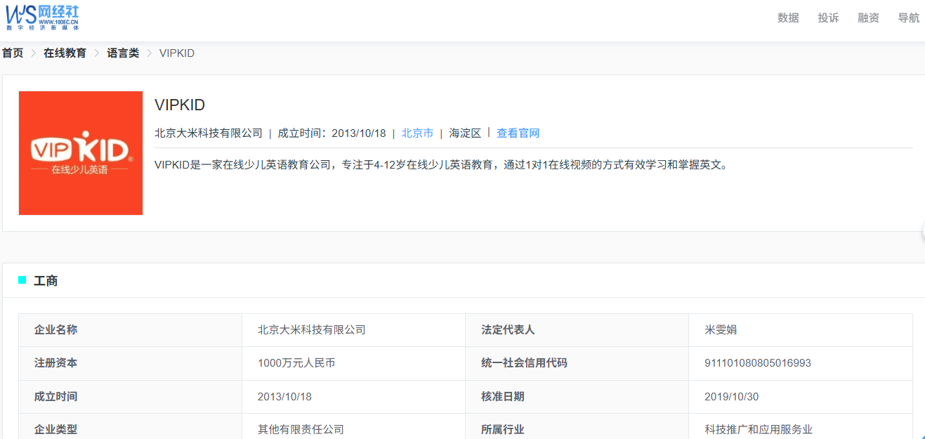 據網經社企業庫顯示,VIPKID是北京大米科技有限公司,法定代表人為米雯娟。
