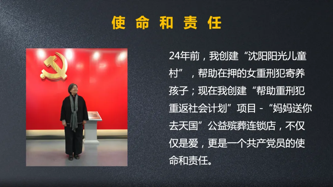 後來有一個勞改犯出來之後,來找我説,媽媽,你領着我們做殯葬得了。我説,媽媽不敢做這個死人活,你去幹,媽媽支持你。他説,我幹不了。我説,為什麼幹不了?他説,殯葬行業屬於特殊行業。我就搞了一下社會調查,因為我這個人性格和別人有點不一樣,越説不行的我越想幹。就這樣在瀋陽調研完了之後,我到大連調研,之後我又到北京調研,調研之後得出的結論,這個特殊的行業存在特殊的問題。後來我就想反正是國家規定,這些重刑犯要碎片化管理,國家有多少個醫院,每個醫院門口就可以安排一個,我找志願者發動社會力量,就可以幫助一個重刑犯就業,再成立一個店,還可以安置一個,所以我就開始研究幫助他們工作,就選了殯葬行業。