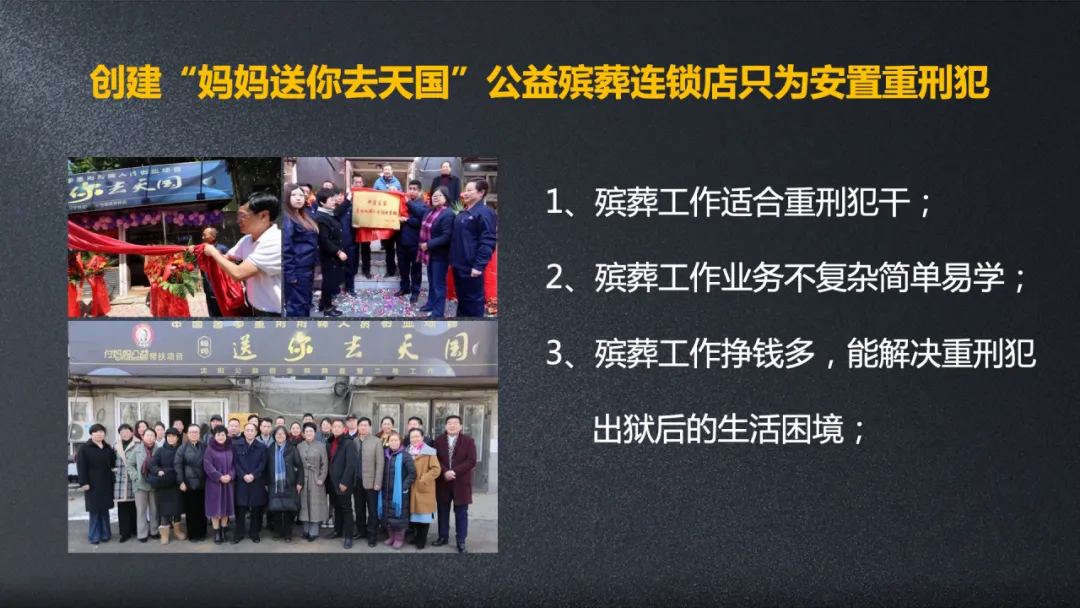 今年我們有個目標是什麼呢?我們要在全國開500家殯葬店,要安置500到1000個重刑犯。我們家這個殯葬店是世界上唯一一個,將公益文化的靈魂,實操植入到殯葬行業,推動中國殯葬行業,成為全國社會治理的一個龍頭企業。我的理念是左手做公益,招募志願者,組建幫教團,右手做商業,用商業解決社會問題,成立殯葬店安置重刑犯,用公益推動商業前行。