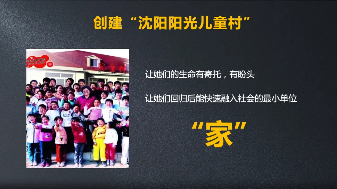 一瞭解,遼寧省女子監獄,當時在押的犯人,有1100個人,有110個因為家庭暴力,把丈夫殺死了,有一半的孩子沒有人管。我就想這是一個社會問題,我一定要把這些無家可歸的孩子給找到。建立一個兒童村,我要把這些無家可歸的孩子收留過來,我要通過這些孩子,呼籲社會遠離家庭暴力,我要通過這些孩子推動國家立法。