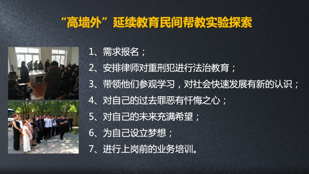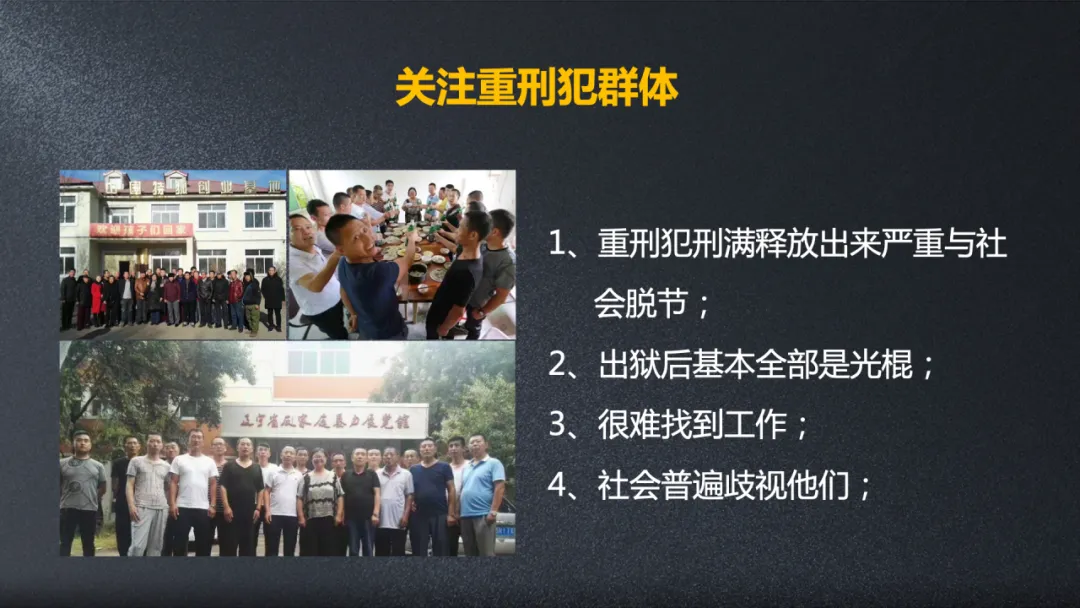 有一次在咱們綜合治理會上講,現在國內國外形勢嚴峻,我們要發動社會一切能夠發動的力量,參與社會治理。當時正好全國打黑除惡,打黑除惡的根源就是什麼呢?你們知道中國這麼大,刑滿釋放人員這個隊伍很龐大的,於是我就毅然決然的決定,我就要幹這件事兒,幫助重刑犯重返社會計劃。