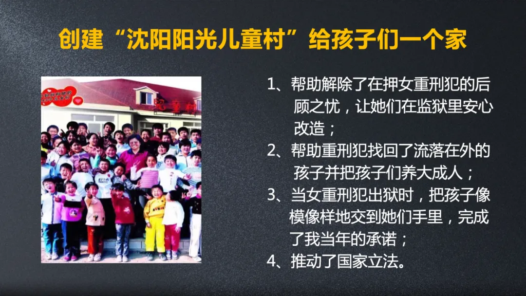 2005年的8月20號,遼寧省率先在全國,在孤兒條例里加了一條,父母服刑期間,孩子沒有監護人的,比照孤兒享受孤兒待遇。遼寧省立法了,我要推動全國的立法,到2019年,全國十二大部門聯合下文件,全國這樣的孩子全部比照孤兒享受孤兒待遇,當時國家宣佈的是50萬孩子。