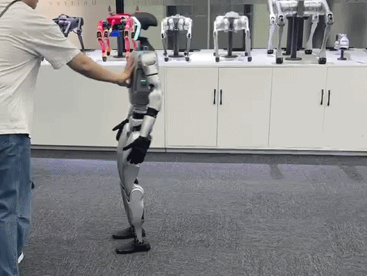遭遇毒手後,G1 的反應非常快,它像人一樣快速叉開雙腿穩定姿態,又後退幾步卸掉力道,一點多餘的動作都沒有。