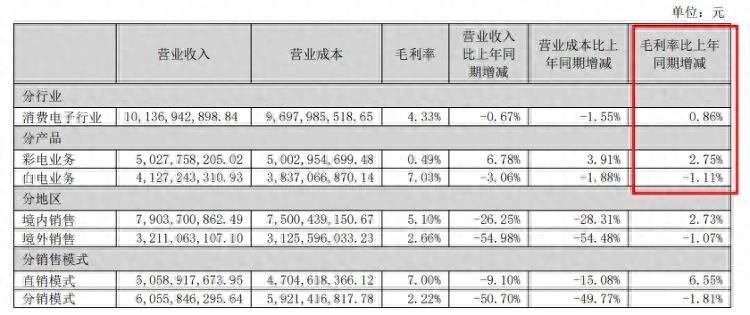 快速規模化的商業戰略帶來兩個結果,一方面是核心基本盤彩電業務的持續縮水,並被競爭對手反超,另外一方面,新業務在營收規模和利潤上亦沒能帶來持續良性的商業回報。