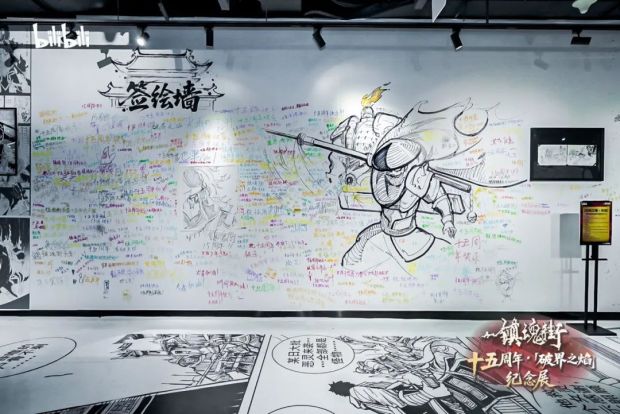 現場還設置了互動共創活動,邀請遊客動手寫下祝福,畫出心中的鎮魂街。其中一位粉絲現場手繪了于禁巨幅畫像,傲然挺立的身姿吸引了許多駐足。形形色色由粉絲共創的籤繪牆,也隨着展覽的進行而不斷得到豐富,成為獻給《鎮魂街》十五週年最具温度的“註腳”。