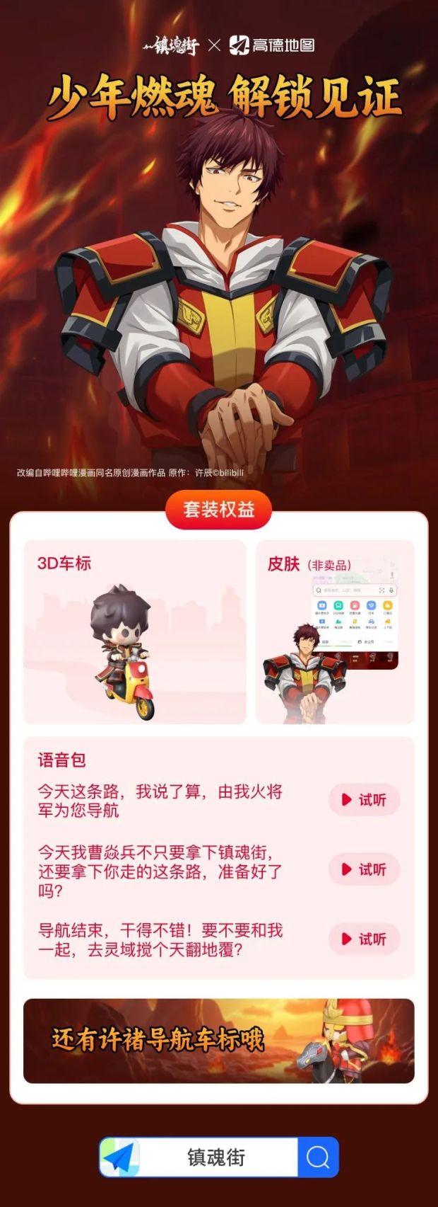 比如與高德地圖合作推出的“鎮魂街語音包”,讓曹焱兵的聲音陪伴用户通勤日常。“今天這條路,我説了算,由我火將軍為您導航”“導航結束,幹得不錯!要不要和我一起,去靈域攪個天翻地覆?”……導航語音融入標誌性台詞、角色性格和世界觀彩蛋,讓老粉會心一笑。
