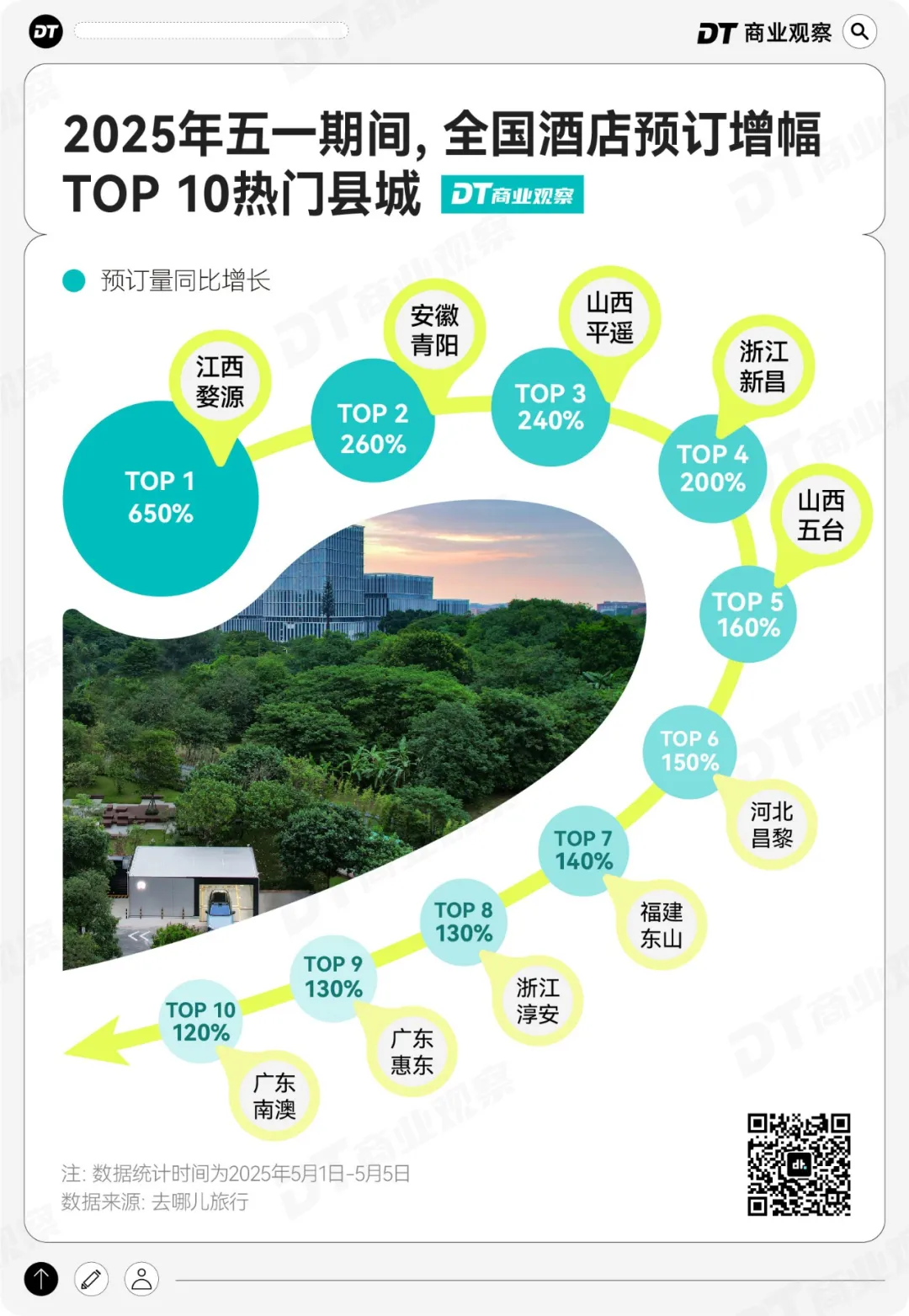 從全國酒店預訂漲幅最高的熱門縣城來看,坐擁萬畝茶園的江西婺源、可以在山野溯溪的安徽青陽、擁有古城牆的山西平遙紛紛上榜。