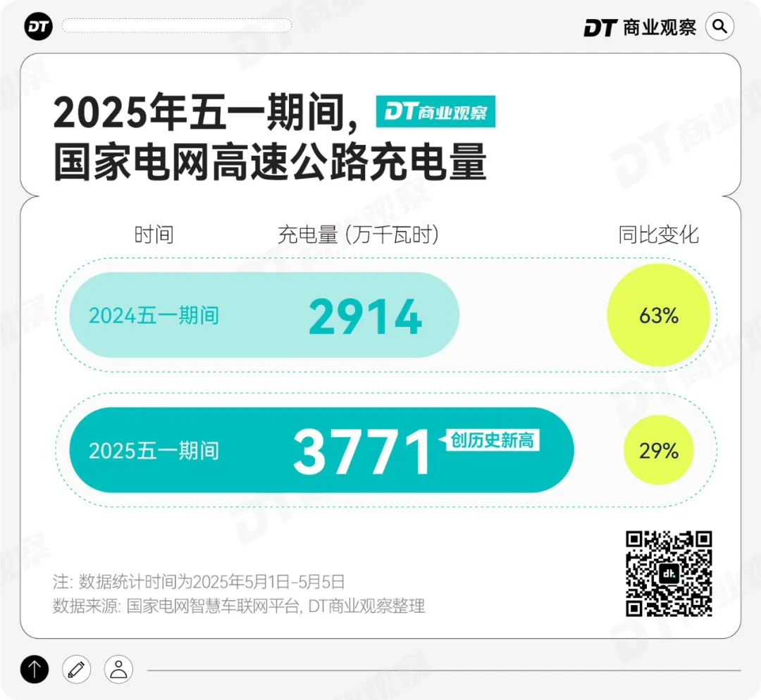 據央視報道,五一期間駕乘新能源汽車出行人數不斷增加,充電量創歷史同期新高。國家電網數據顯示,五一期間充電量超1.24億千瓦時,同比增長超20%,其中,高速公路充電量超3771萬千瓦時,同比增長超29%,也創造了歷史新高。