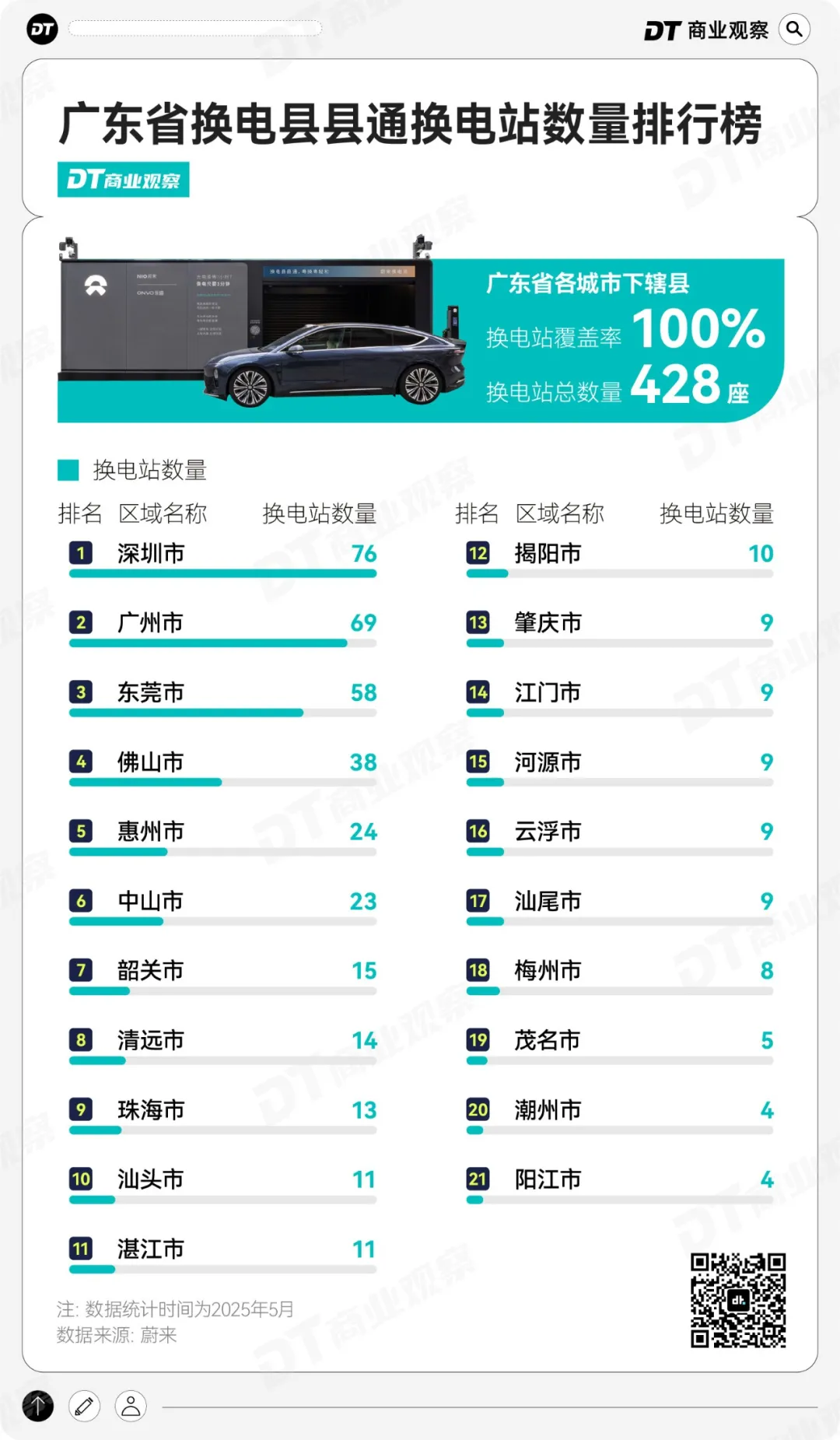 “加電縣縣通”計劃分為兩部分,分別是“充電縣縣通”和“換電縣縣通”。就在今年五一假期前幾天,隨着第3300座換電站在湛江赤坎區落成,蔚來已在廣東建成428座換電站,覆蓋全省122個區縣,標誌着廣東省“換電縣縣通”的完成。