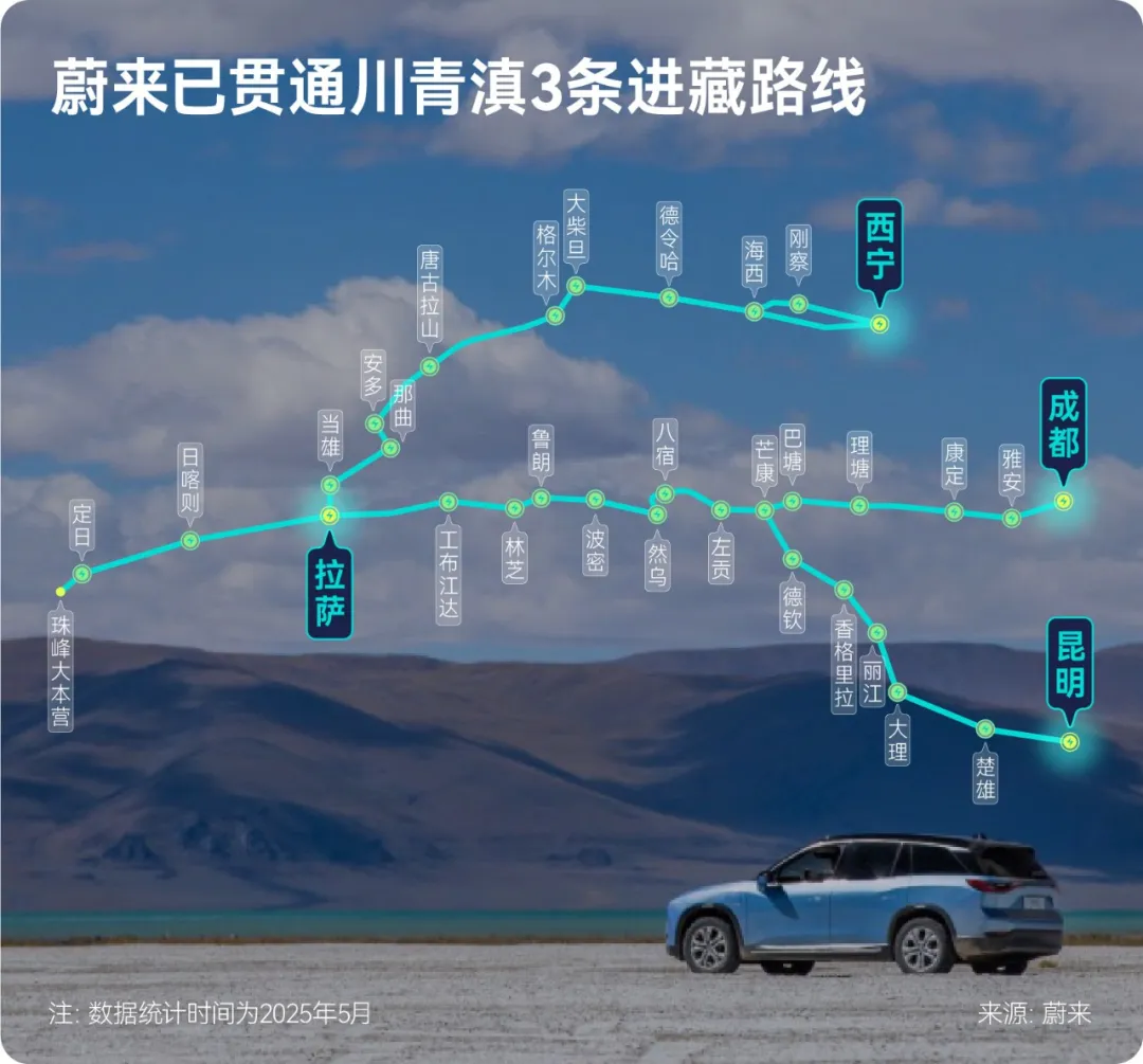 如今,蔚來Power Journeys加電風景線,已貫通78條極具吸引力的路線,其中包括川青滇3條進藏路線。