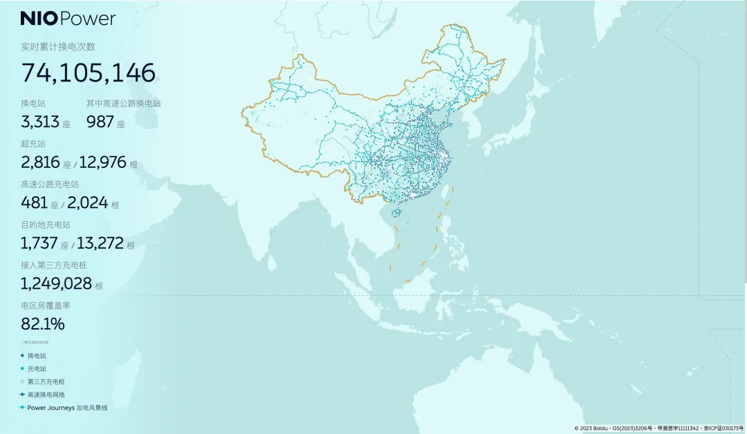 目前,蔚來已在北京、上海、江蘇、浙江、廣東實現了“換電縣縣通”。
