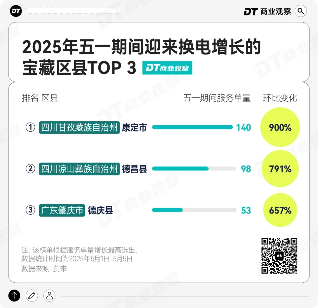 作為縣域經濟的“隱形基建”,縣城換電站佈局與旅遊消費呈現強相關性。蔚來數據顯示,今年五一期間,四川康定、四川德昌、廣東德慶等縣城的換電站單量環比增長驚人。