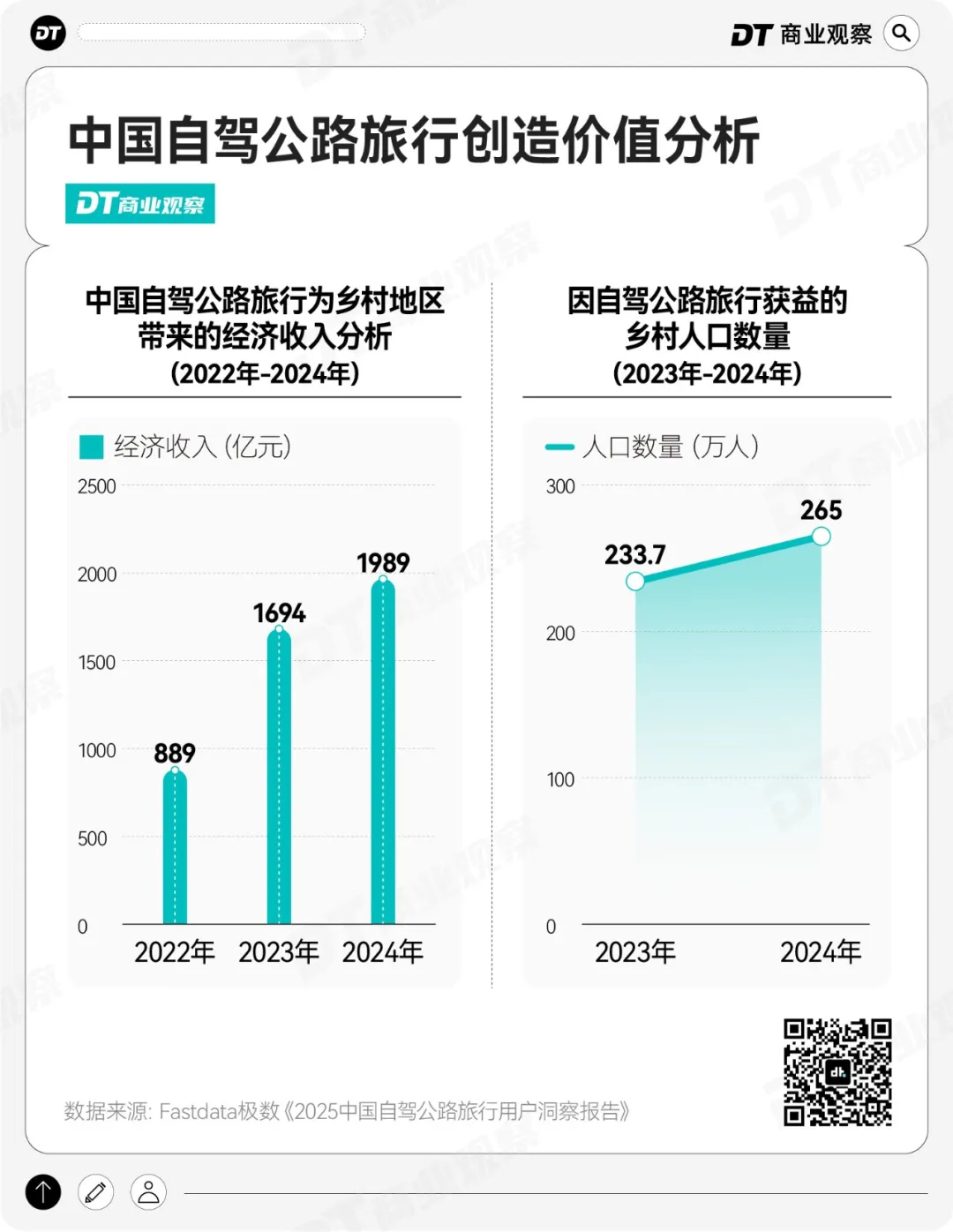 Fastdata極數發佈的《2025中國自駕公路旅行用户洞察報告》顯示,2024年自駕遊為鄉村帶來1989億元經濟效益,265萬人因此而受益,自駕公路旅行對鄉村振興具有積極意義。