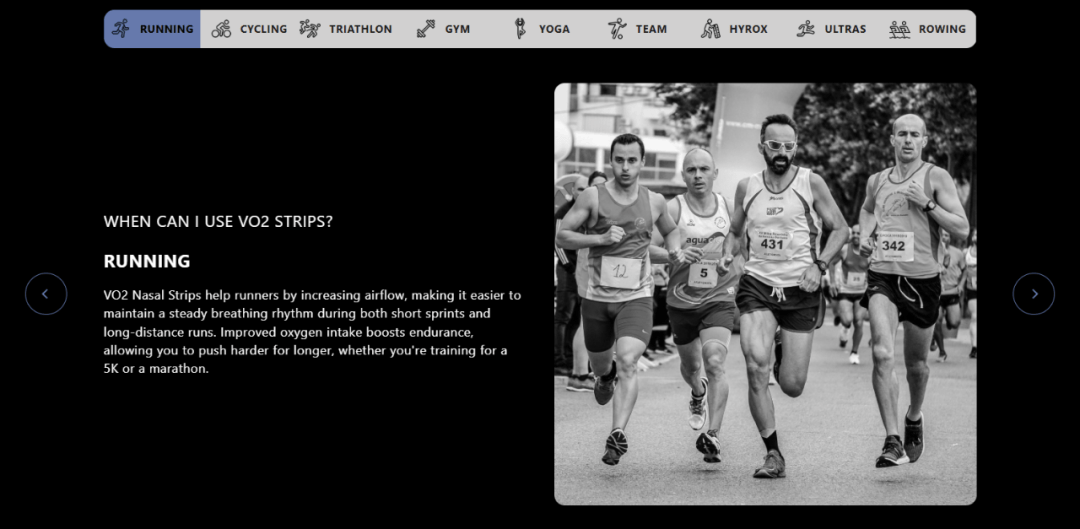 2024年初,一家錨定運動消費羣體的鼻貼品牌VO2成立,官網上它介紹自己道:「我們幫助運動員呼吸。」並聲稱能在路跑、瑜伽、HYROX、團體項目等9種類運動中產生積極影響。
