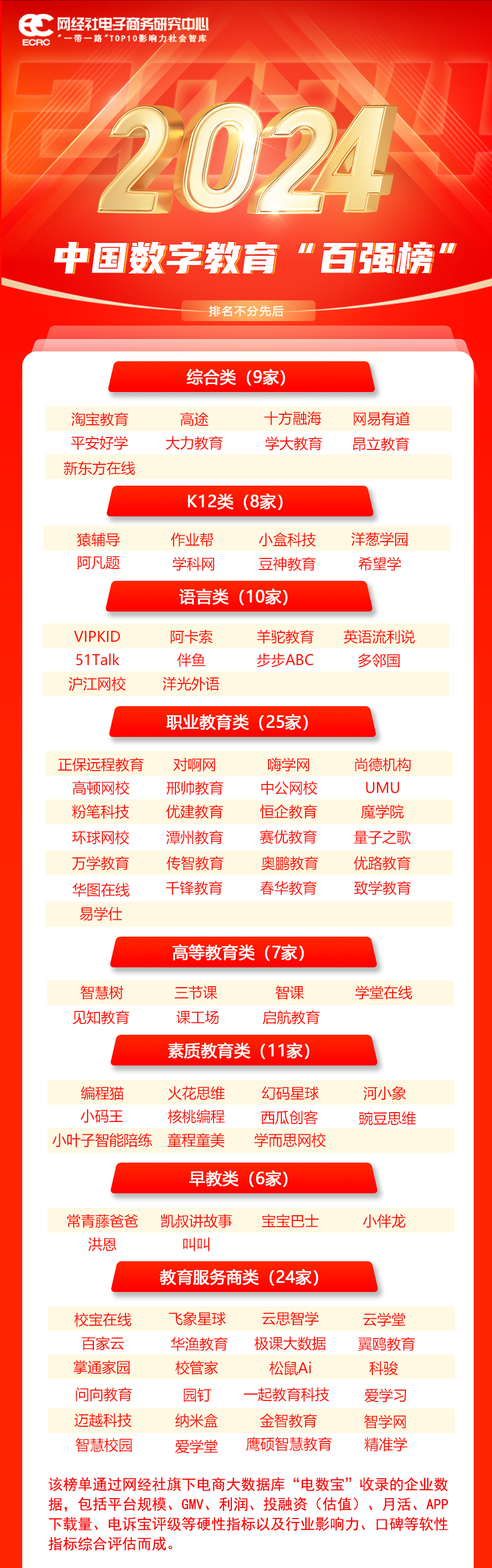 《報告》披露了《2024年中國數字教育“百強榜”》,這也是網經社連續第6年發佈數字教育百強榜。該榜單經過網經社電子商務研究中心根據電商大數據庫“電數寶”收錄的企業數據,包括平台規模、營收、利潤、投融資(估值)、月活、評級等硬性指標以及行業影響力、口碑等軟性指標綜合評估而成。