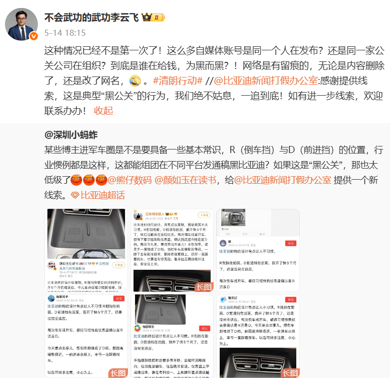 這估計是比亞迪被黑的最慘的一次了。近日,大量微博賬號發佈同樣文案,批評比亞迪車輛檔位設計不合理,容易引發安全事故。沒想到引發全網嘲笑,被指黑公關連科目一都沒過。面對突如其來的質疑,比亞迪都不知道怎麼解釋了。