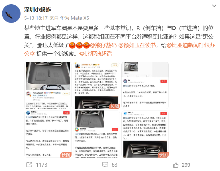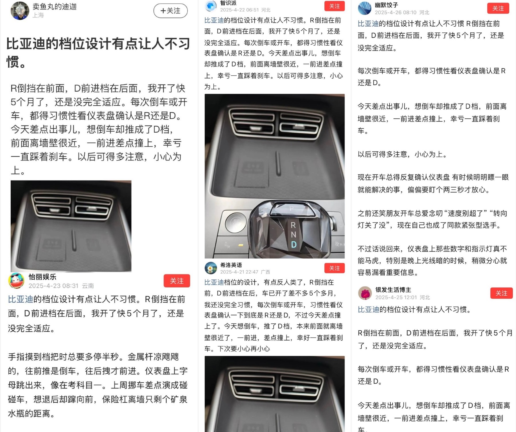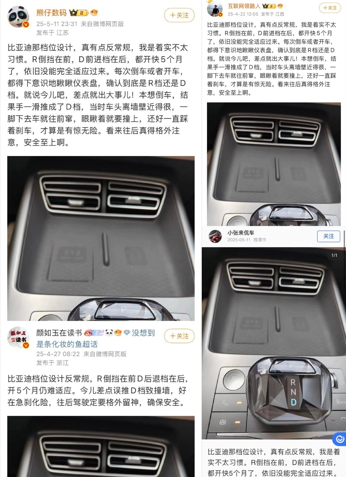 5月13日,一個為名名為“深圳小螞蚱”的網友在微博發文,彙總了大量截圖。截圖顯示,有很多博主在微博等平台發文,比亞迪車輛的檔位設計D檔和R檔嚴重不合理。