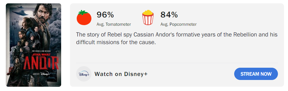 當然,在迪士尼推出的“星戰”劇集中,《安多》的整體風評仍穩居第一陣營,即便眼光挑剔的粉絲也不乏讚譽。前述《歐比旺》在爛番茄上的兩項指標為82%和61%,另一部衍生作《阿索卡》則錄得85%和64%,而《星球大戰:侍者》僅有78%和19%,後者在第一季播出後便被迪士尼取消。