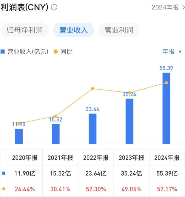 鉅子生物營收從2022年的23.64億元增長至2024年的55.39億元。同期,歸母淨利潤從6.96億元增長到20.62億元,速度之快令人驚歎。