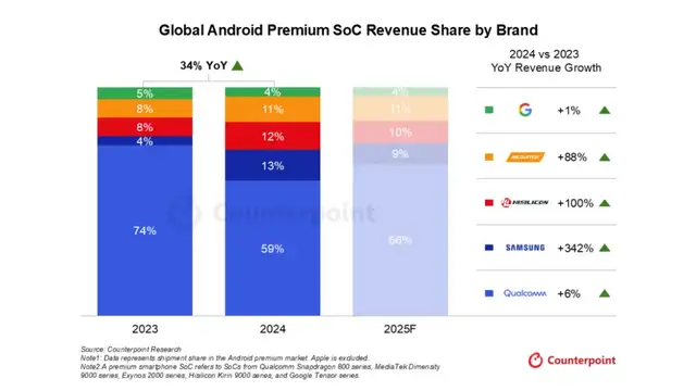 根據 Counterpoint Research《2024 年 Q4 全球智能手機 SoC 營收與預測追蹤報告》顯示,受消費者對高端智能手機的強烈偏好推動,2024年高端安卓智能手機SoC收入同比增長34% 。出貨量增長和平均售價上漲也推動了收入增長。